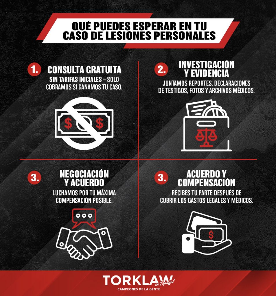 Lidiar con un caso de lesiones personales puede ser intimidante y estresante, especialmente si es la primera vez que pasas por eso. Ya sea que hayas sufrido lesiones en un accidente de auto o motocicleta, una caída, una mordida de perro, un accidente en un parque de diversiones o cualquier otro tipo de accidente debido a la negligencia de otra persona, TORKLAW está aquí para ayudarte a entender qué esperar de estas situaciones.